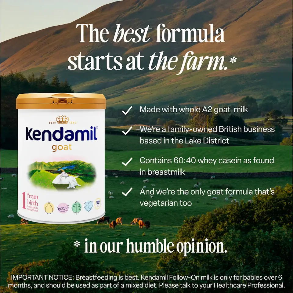 Welcome to our homeKendamil is a family business located in the English Lake District, a UNESCO World Heritage Site and the place we proudly call home.With over 60 years’ expertise in infant nutrition, we combine the finest, natural ingredients to develop a unique infant goat milk as kind as your baby.Closer to nature and kinder by miles.With love from KendamilMoving to stage 2Kendamil Goat Follow-On Milk is designed to support your baby’s changing needs through their next exciting phase of growth and development– For infants 6-12 months– Nutritionally balanced to support growth– Whole A2 milk fats, no palm oil, no fish oil