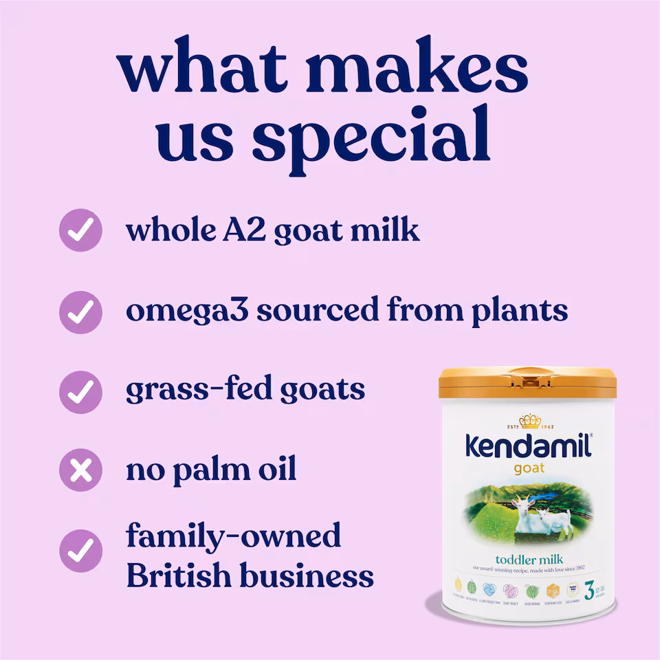 KENDAMIL GOAT TDLR MILK STAGE 3, 12-36M 800GFrom our family to yoursUK RecipeAward-winning recipe, developed in the UKFamily BusinessOur local family business puts your family firstFrom farm to formulaA2 Whole MilkWe proudly use whole A2 goat milk fatsNo Palm OilKinder to your baby and our planetGoat Whey60:40 whey: casein, as found in breastmilkPlant-Based DHAUniquely fish-free omega-3, protecting our oceansVegetarianThe only goat formula that is veggie friendlyAward-winningQueen’s AwardProud winners of the Queen’s award60+ Years of scienceImmune system + vitamin D¹Visual development + DHA³MFGM‡, 3′-GL‡, 4′-GL‡, 6’GL‡Cognitive development + iron²Physical growth + calcium4, lodine5‡As identified within human breastmilk, MFGM = Milk FatGlobule Membrane +Normal functioning as contributed to by the below referenced ingredients.¹Vitamin D contributes to the normal function of the immune system in children, ²Iron contributes to normal cognitive development of children, ³DHA contributes to the normal visual development of infants up to 12 months of age. Benefit from daily intake of 100mg of DHA, ⁴Calcium is needed for normal growth and development of bone in children, ⁵lodine contributes to the normal growth of children.